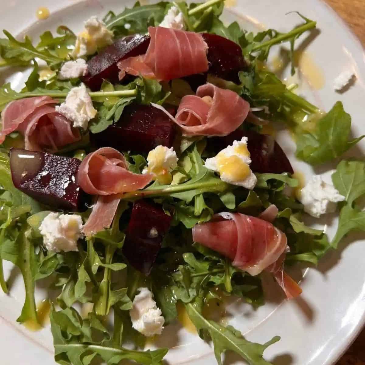 This arugula salad with roasted beets and prosciutto was absolutely delicious! The vinaigrette was light and refreshing, and it tied the whole salad together perfectly. I highly recommend this salad for a special occasion or just a weeknight treat.