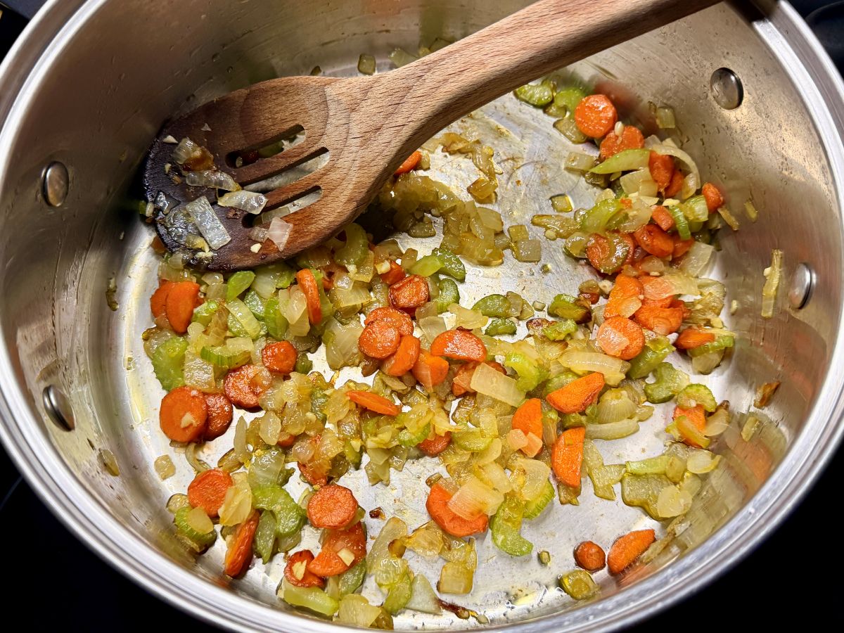 Start by softening your onion, carrot, and celery in a little olive oil. This is the part that builds the base flavor, so don't rush it.