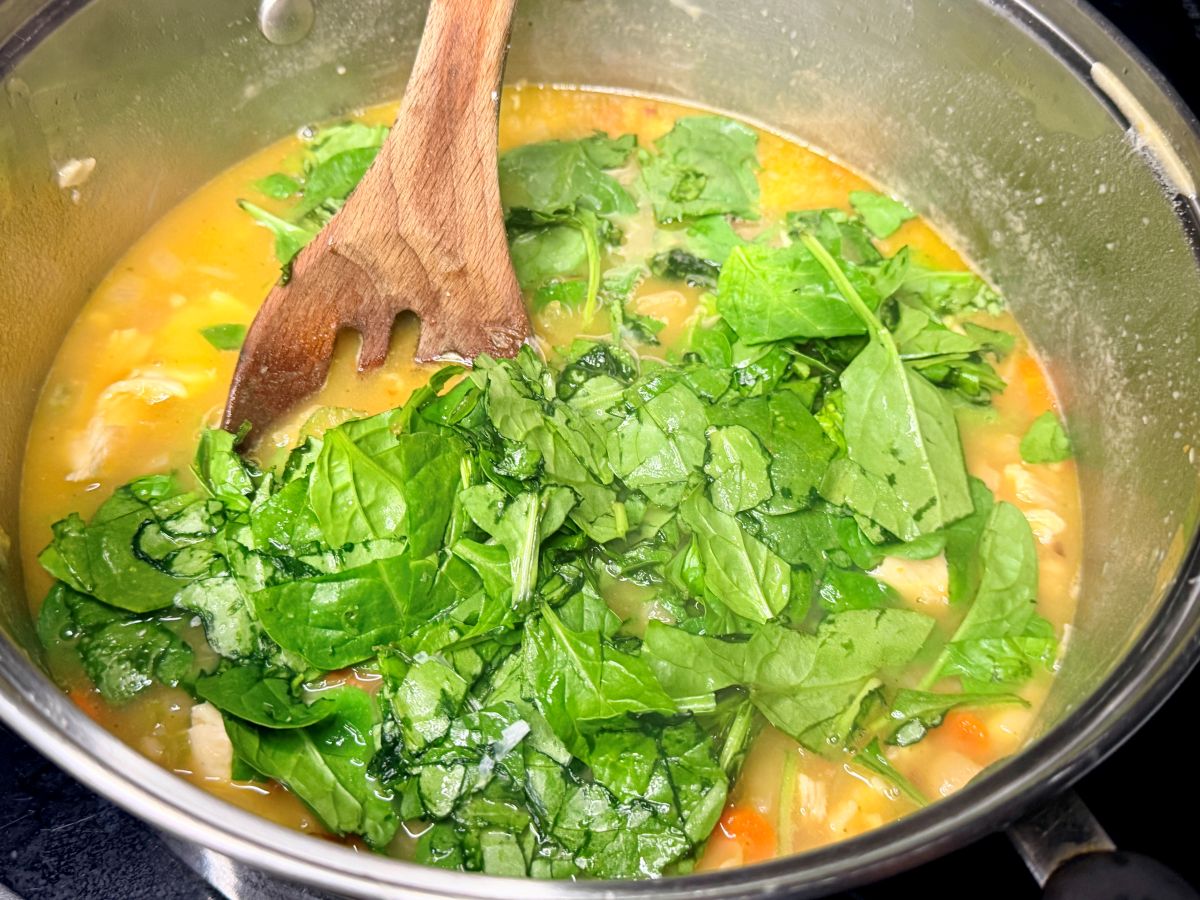 The spinach goes in right at the end - it only needs a minute to wilt.