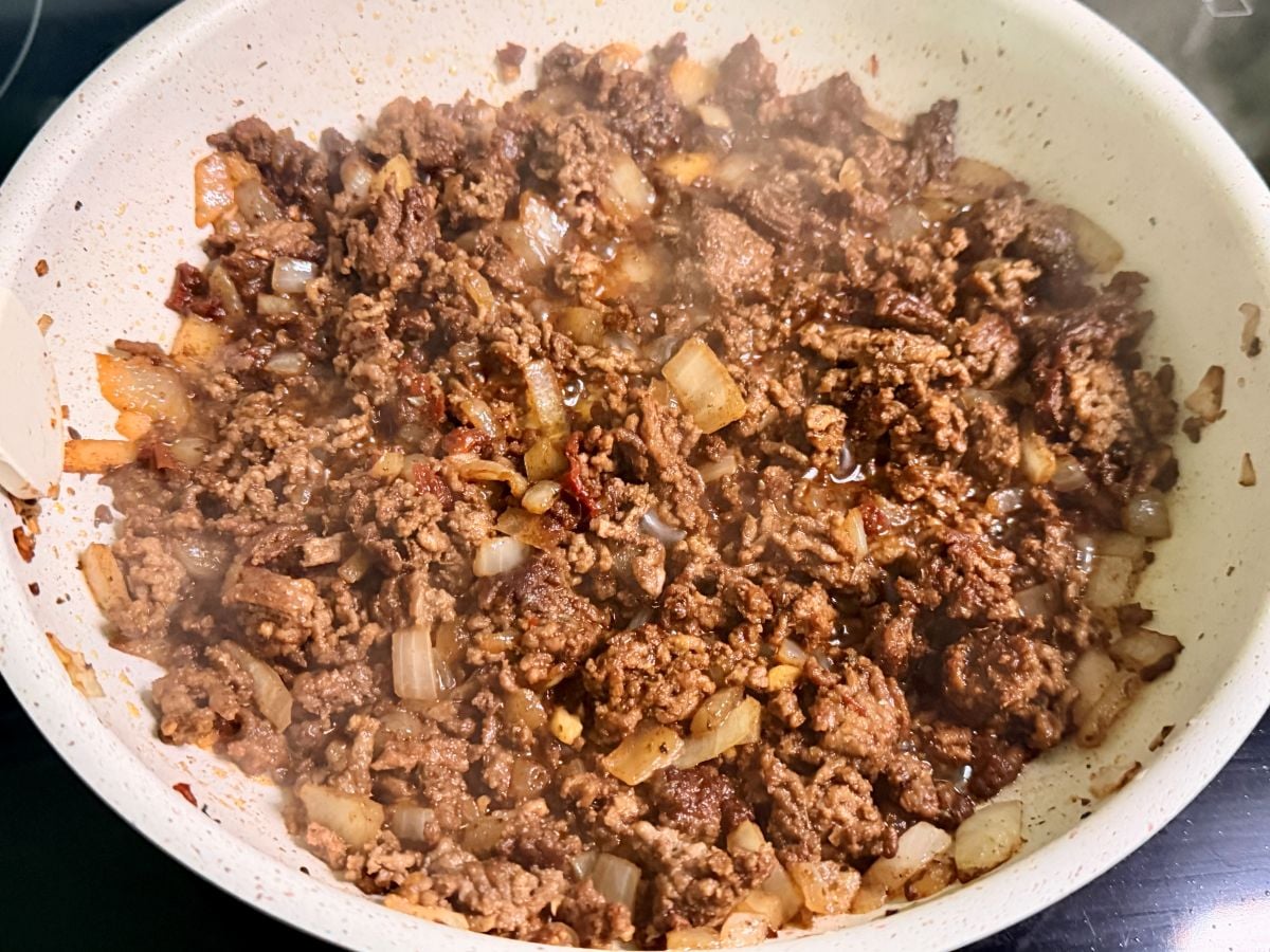 While that's resting, cook your ground beef with onion, garlic, and spices until it's browned and well seasoned. Keep it warm.