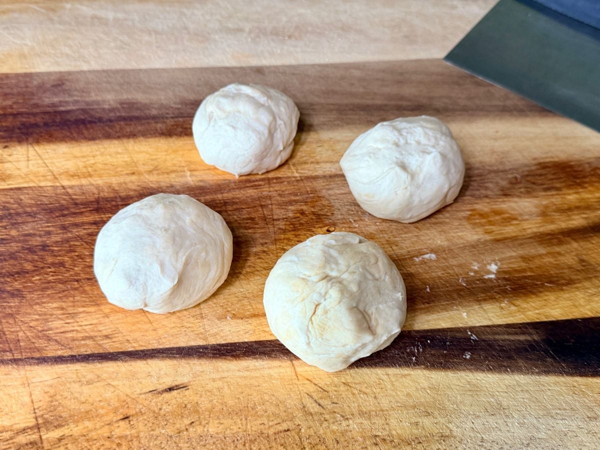 - Divide the dough into 4 equal pieces and roll each into a ball.