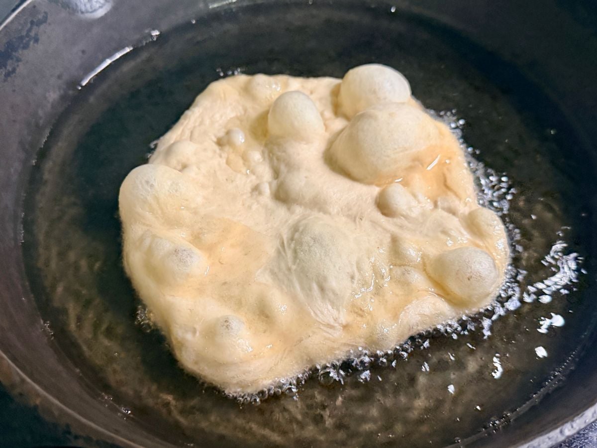 - Carefully place the dough into the hot oil. Fry until the edges are golden, then flip and cook the other side until golden.