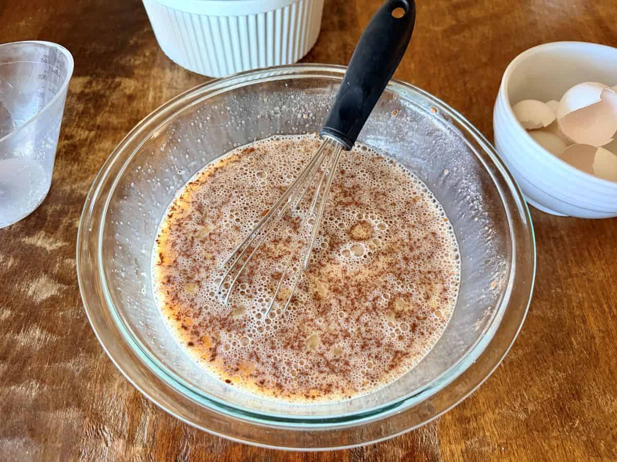 Whisk together the eggs, sugar, milk, vanilla, cinnamon, and nutmeg until smooth.