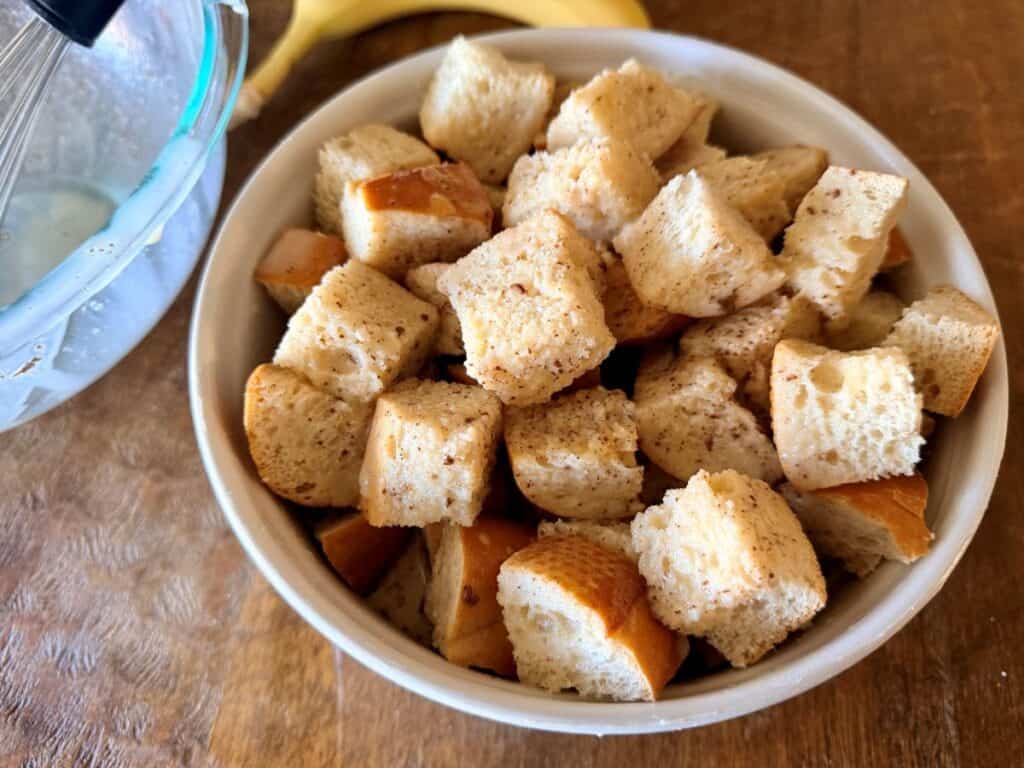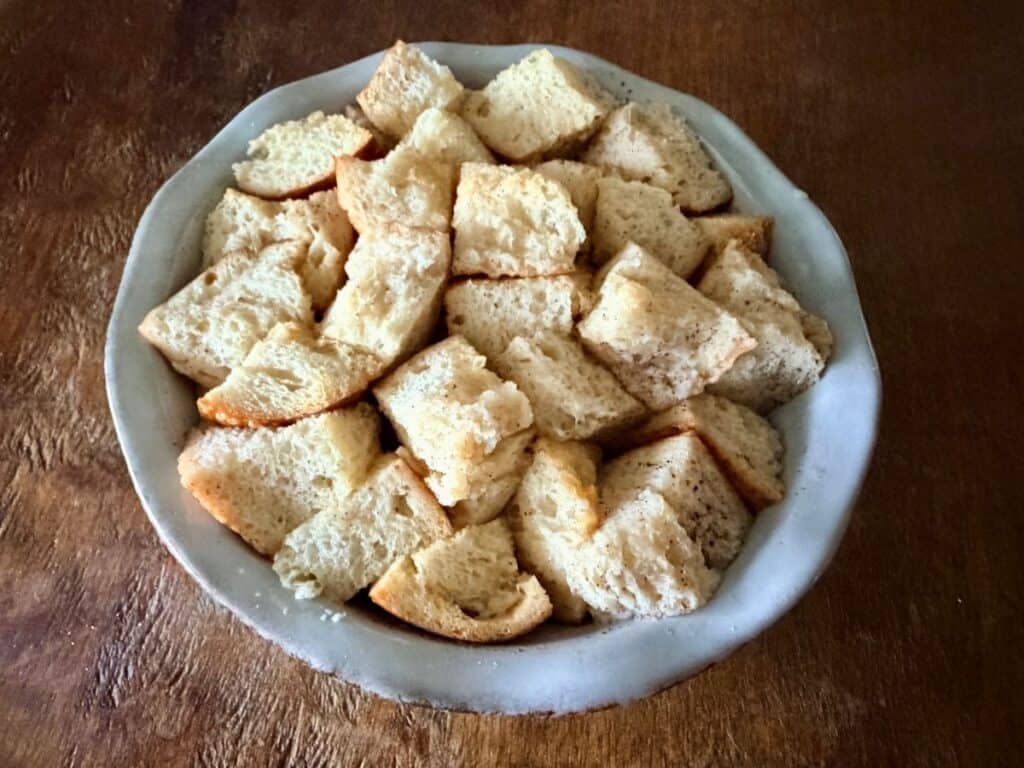 Start by cutting your French bread into 1-inch cubes and let them sit out to dry slightly, or toast briefly in the oven.