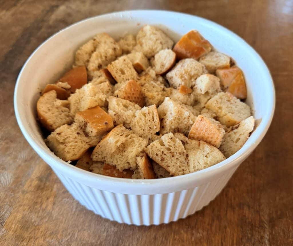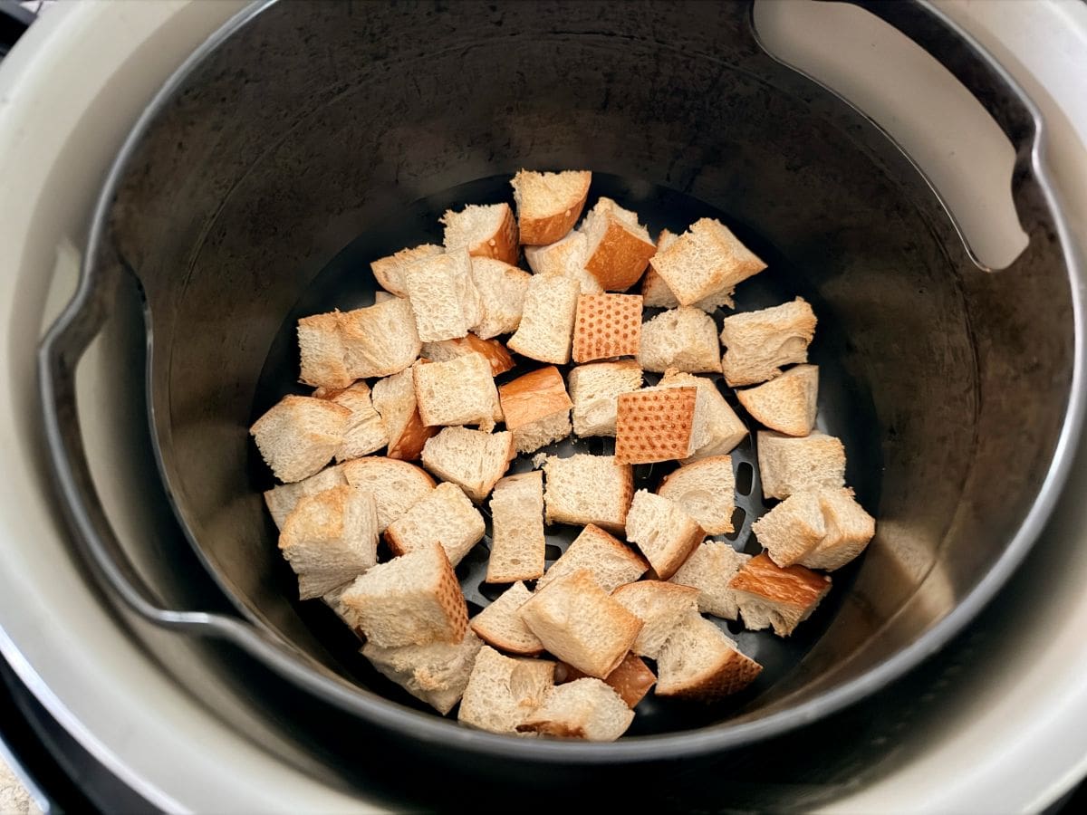 If you don't want to heat your RV oven, your air fryer can save the day. I use mine constantly when we travel - it's hands-down one of my best friends in the RV kitchen. To dry out bread cubes, just toss them in the air fryer basket and cook at 300°F for about 3 minutes, shaking halfway through. They'll come out perfectly crisp on the edges and ready to soak up all that rich custard - no waiting overnight required.