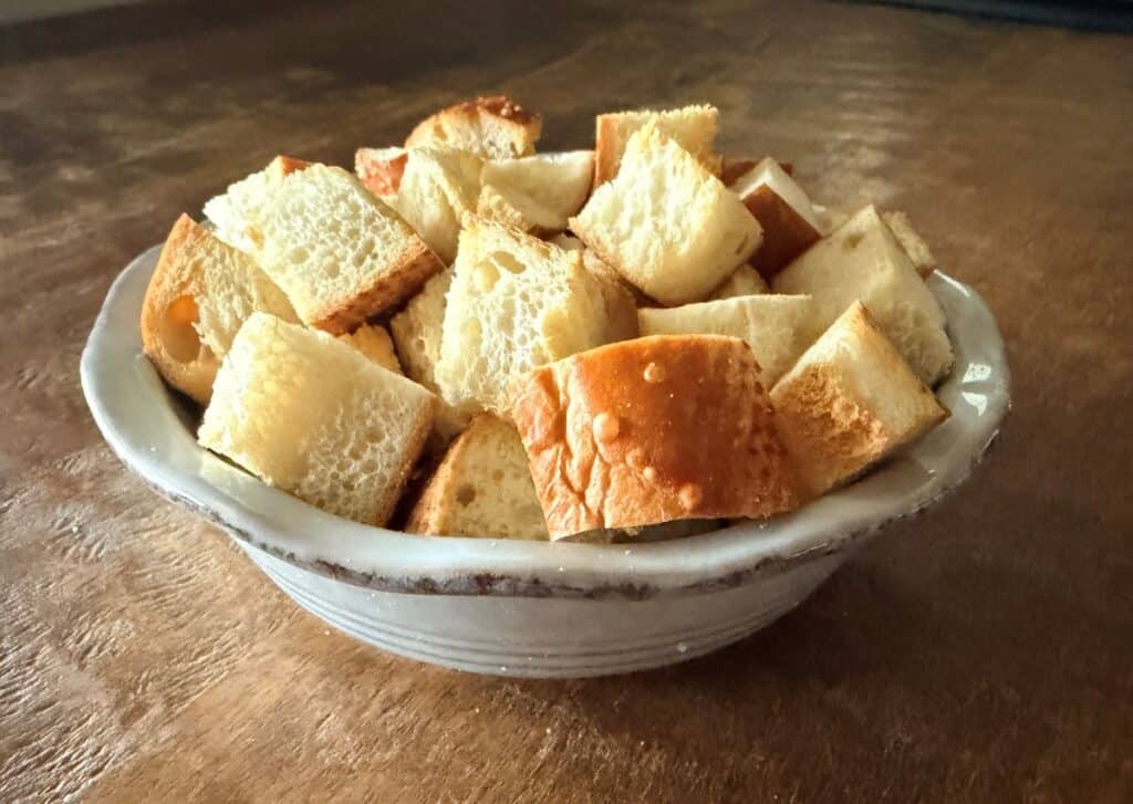 - Cut the French bread into 1-inch cubes. If you already have stale bread, great! If not, let it sit out to dry slightly, or bake at 300°F for 10-15 minutes until lightly crisp.