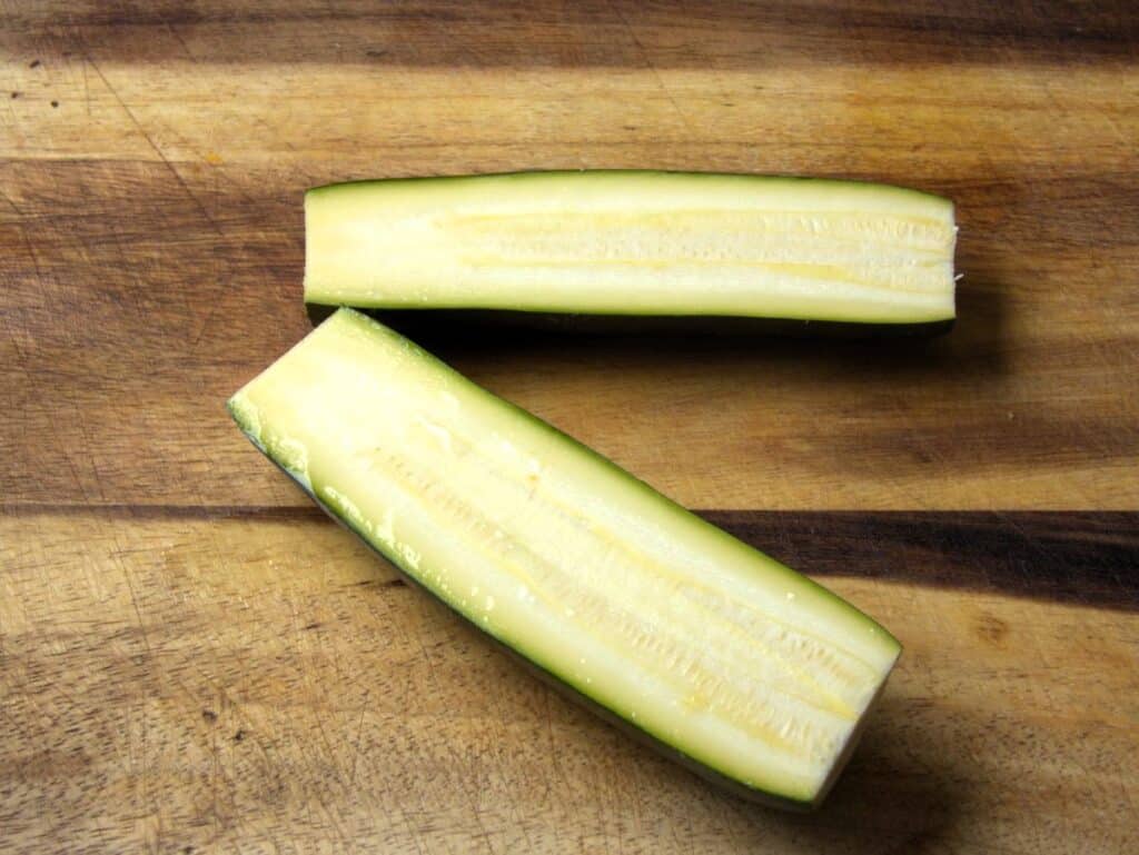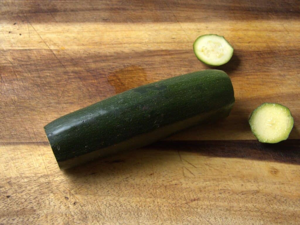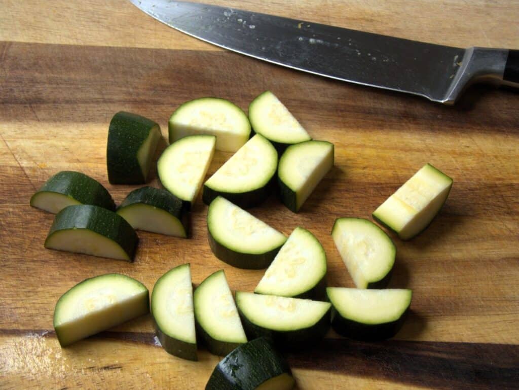 Slice the ends off two medium-sized zucchini. Cut them in half across and then again lengthwise. Now slice into half moons.