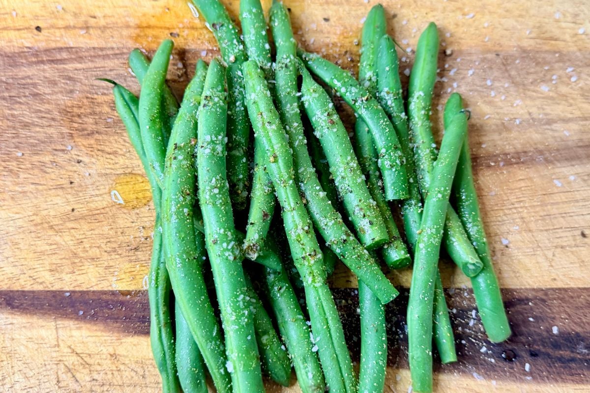 On the other side of the pan, toss the green beans with a drizzle of olive oil, a pinch of salt, and black pepper. Spread them into a single layer.