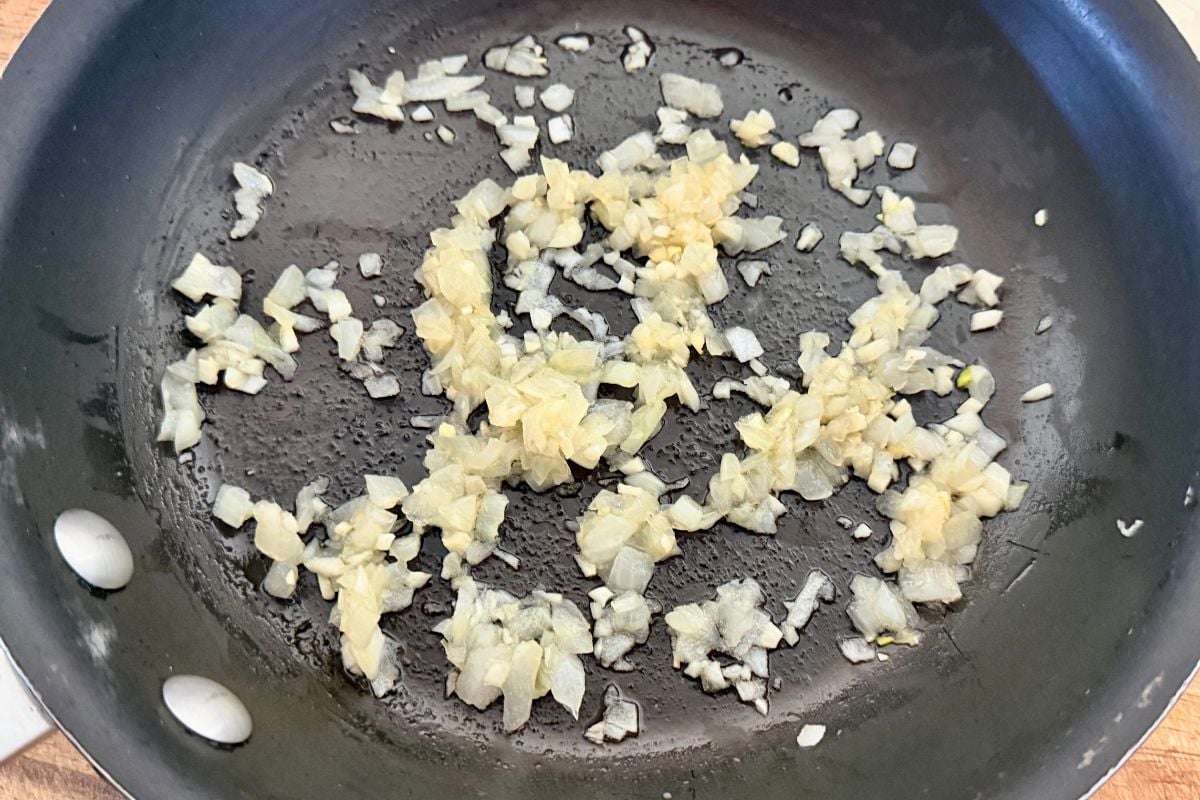 - In a small skillet, warm 1 teaspoon of olive oil over medium heat. Add 2 tablespoons finely chopped onion and cook until soft and lightly golden, about 3-4 minutes. Stir in 1 small minced garlic clove and cook for another 30 seconds. Remove from heat and let it cool slightly.