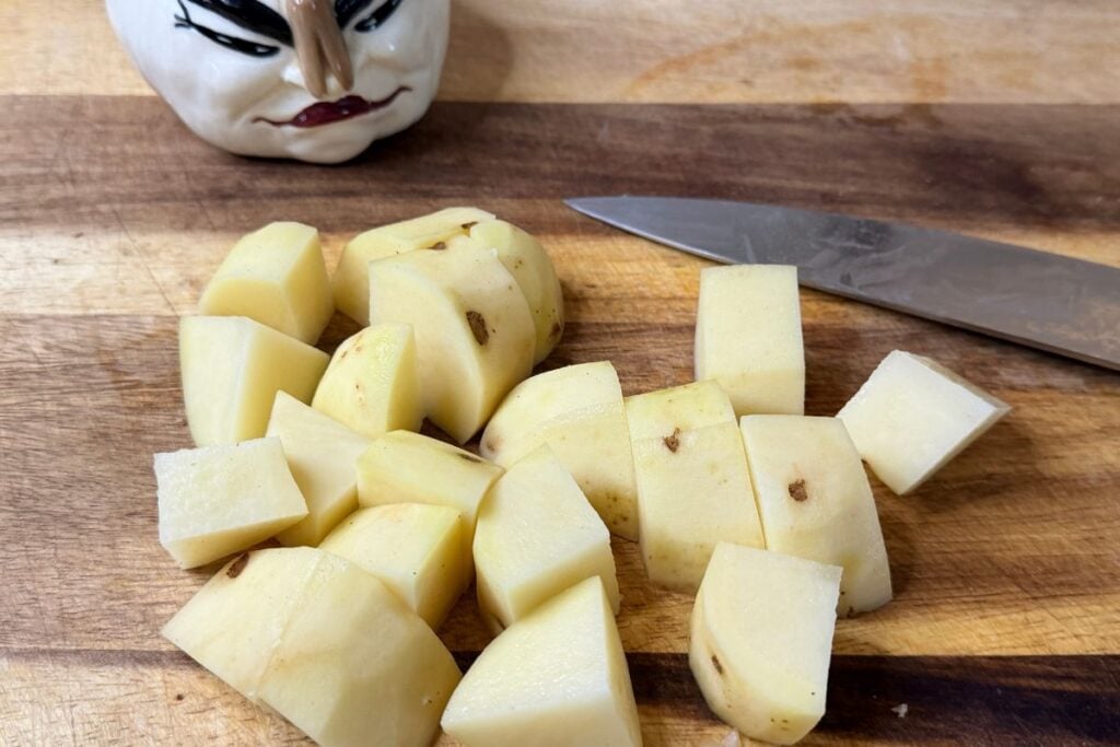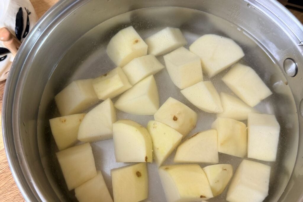 While the meatloaf bakes, boil the cubed potatoes in salted water until tender. Drain, then mash with butter, milk, and a little salt and pepper until creamy.