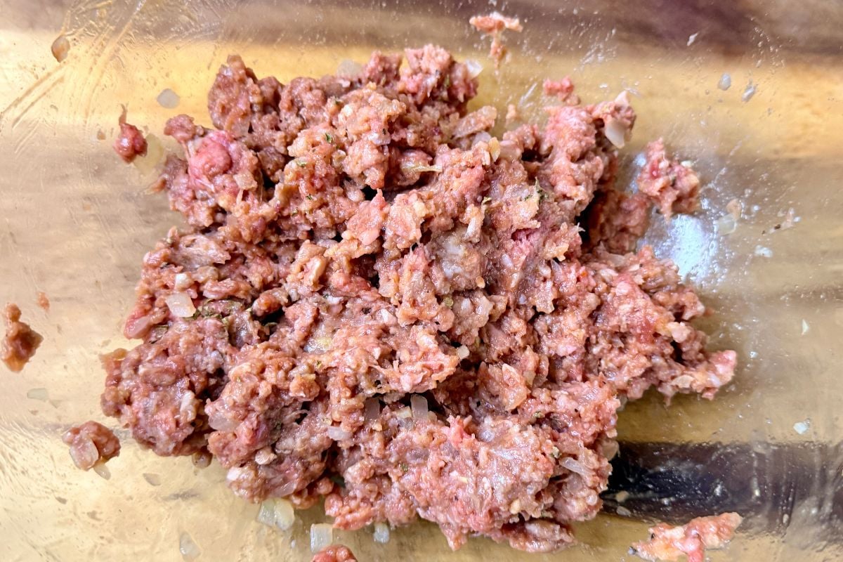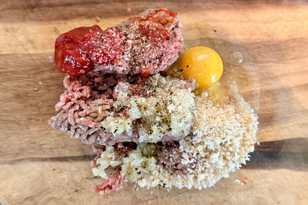 In a medium bowl, combine the ground beef, sautéed onion and garlic, ketchup, Worcestershire sauce, salt, breadcrumbs, and egg.