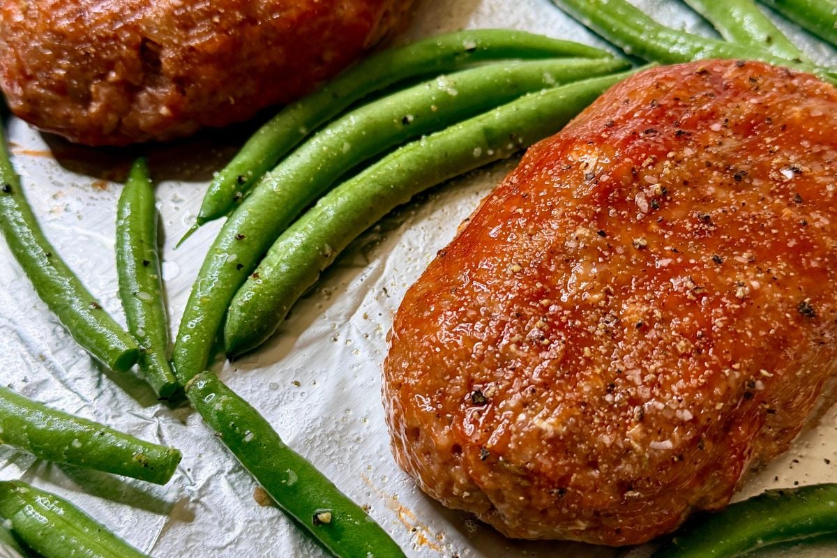 - Roast everything together for 20-25 minutes, until the meatloaves are cooked through (160°F internally) and the green beans are lightly caramelized and tender-crisp.