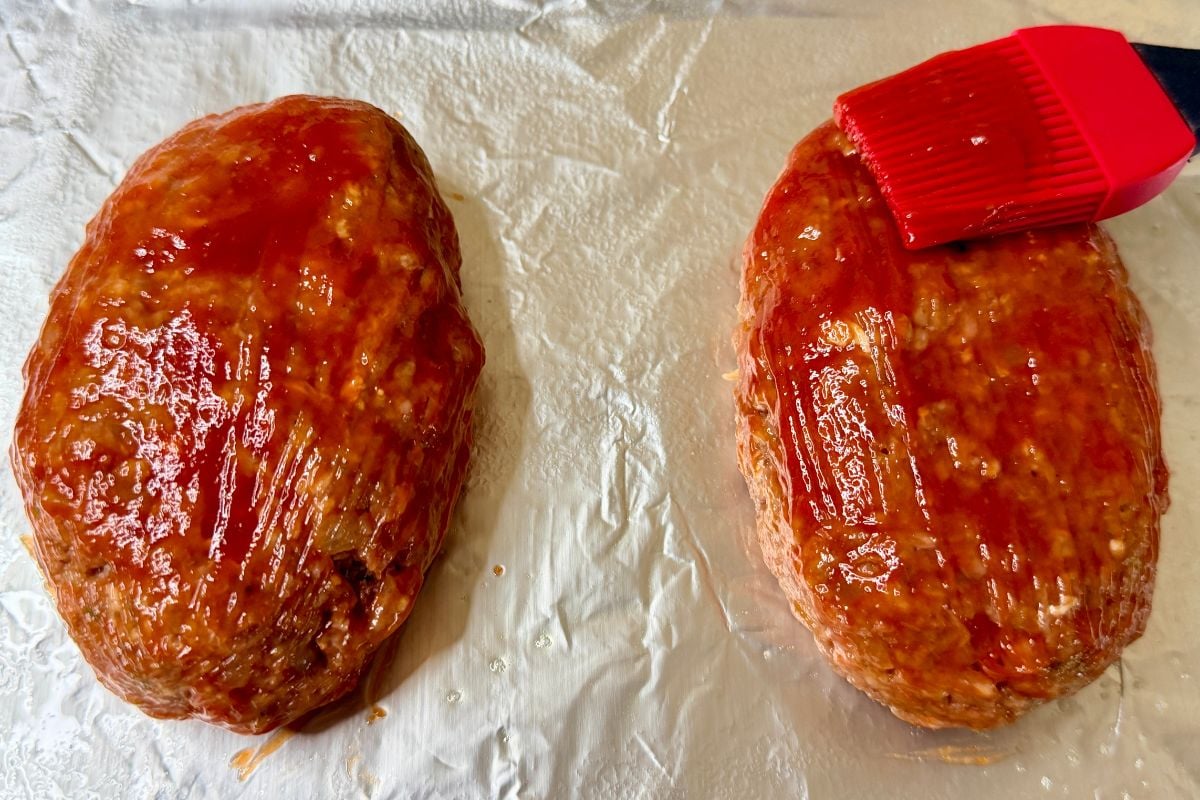 - Form the mixture into two small loaves and place them on one side of your prepared baking sheet. Brush the tops with a little extra ketchup.