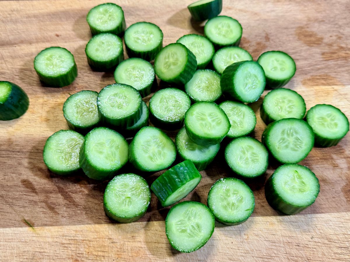Slice the cucumbers into thick pieces. Thicker slices hold their shape better and stay crunchy, even after resting in the dressing. This step is key to getting that cold, crisp texture that makes these cucumbers so good.
