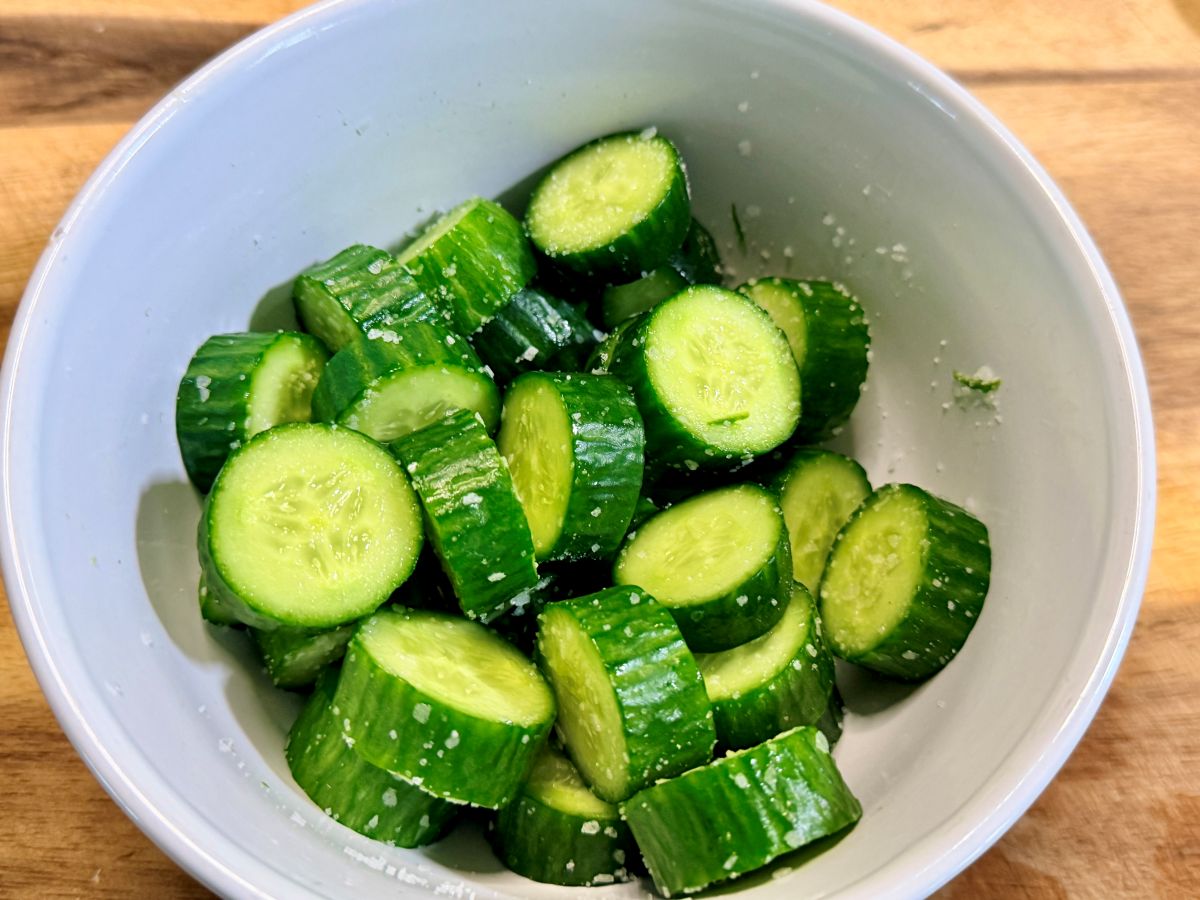 Add the sliced cucumbers to a small bowl and sprinkle with kosher salt. Toss gently to coat, making sure the salt is evenly distributed. Cover and refrigerate for about 30 minutes.