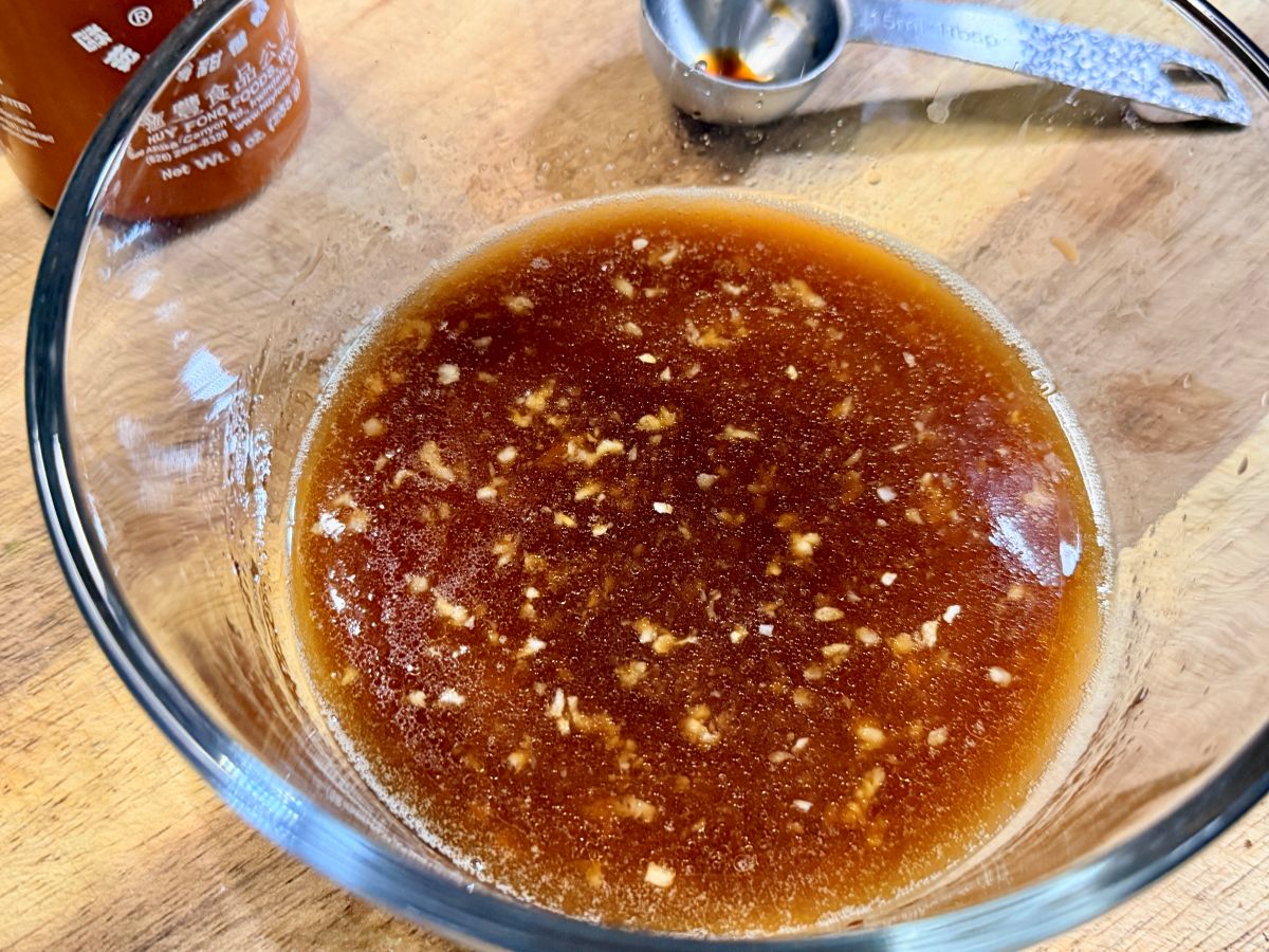 - While they're resting, whisk together the rice vinegar, soy sauce, sugar, mirin, sesame oil, garlic, sriracha, and salt until the sugar dissolves.
