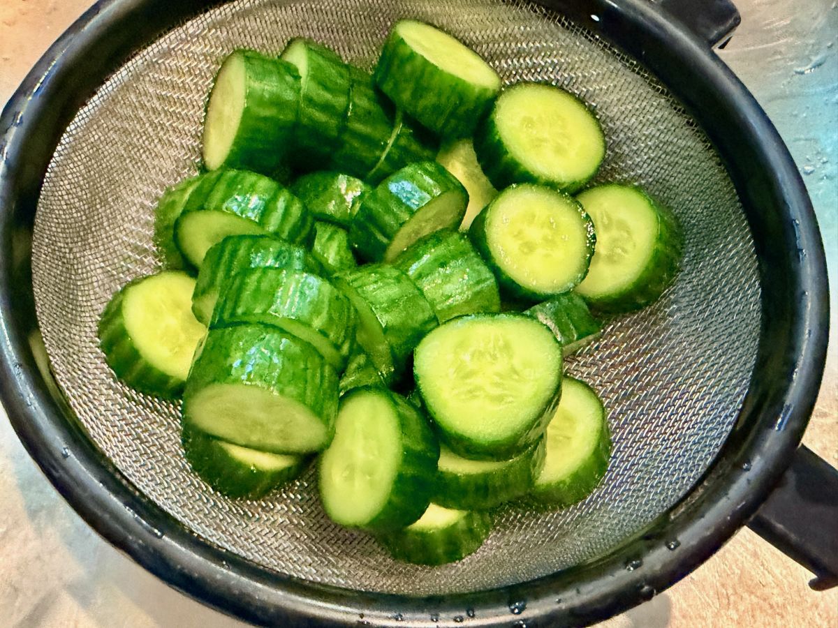 - Add the sliced cucumbers to a small bowl, sprinkle with the kosher salt, and toss to coat. Cover and refrigerate for 30 minutes. This draws out excess moisture and gives you that signature crunch.
