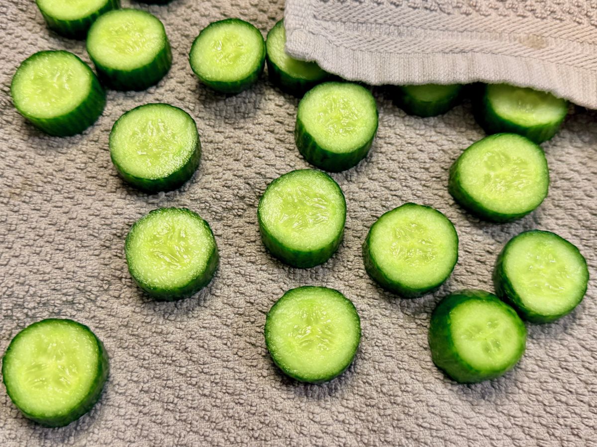 - Rinse the cucumbers well under cold water and pat them dry. You want them seasoned, not salty.