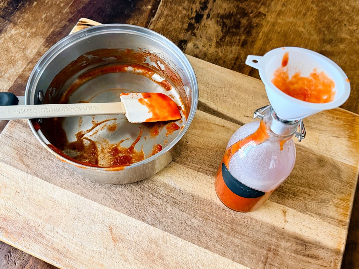 Carefully pour the sauce into a clean glass bottle or jar. A small funnel makes this part much easier and keeps things from getting messy.