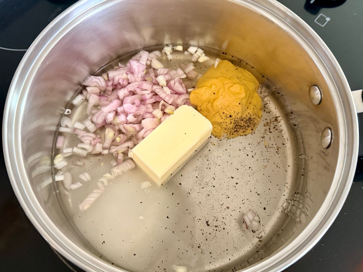 In a saucepan, combine the water, onion, sugar, butter, mustard, vinegar, and black pepper. Bring it to a boil, then lower the heat and let it simmer. This is where the base comes together, and the onion softens.